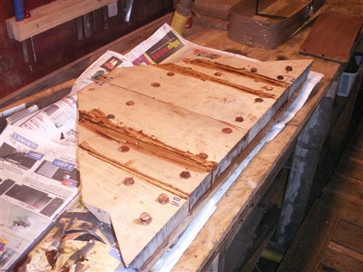Ekbiten bakom stäven, ett fundament på vilket mycket ska vila. Den är sammanfogad av flera solida ekbitar, som limmats ihop med epoxylim och sedan skruvats ihop. Det blir oerhört starkt. Nu ska den inpassas och hyvlas på plats.